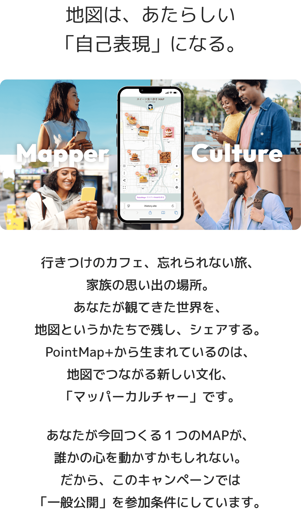 - A はい。本キャンペーンでは「一般公開」設定での公開が必須です。URL限定・パスワード限定・非公開のマップは抽選対象外となります。あなたの地図が、誰かの新しい発見につながることを願っています。